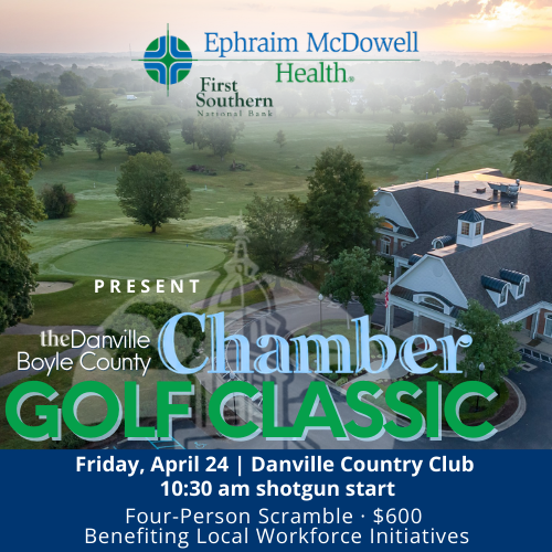 Join us for the Danville-Boyle County Chamber Golf Classic, a four-person scramble benefiting local workforce initiatives and supporting business growth in our community. Presented by Title Sponsor Ephraim McDowell Health and Presenting Sponsor First Southern National Bank, this tournament is a great opportunity for professional networking, team building, and a fun day on the course. Register your team, enjoy a day of golf at Danville Country Club, and help us invest in the future of Boyle County’s workforce.